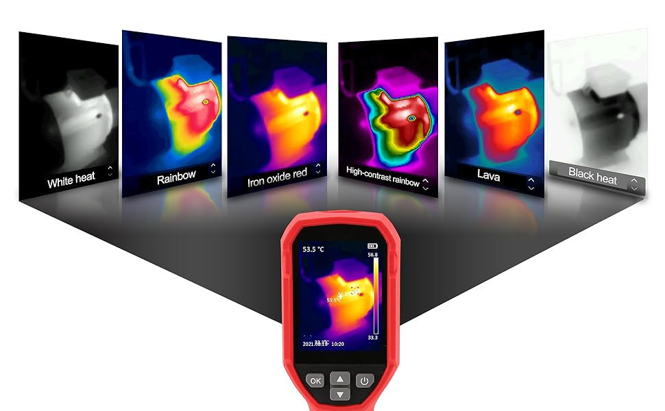 - 6 color palettes for clear visualization: White heat, Rainbow, Iron oxide red, High-contrast rainbow, Lava, Black heat